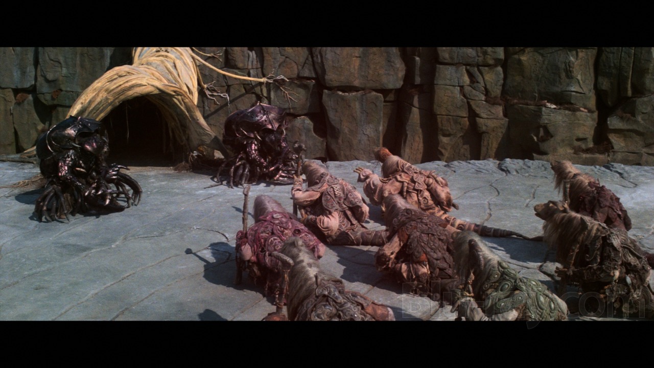 I think I commented a while back that I found the 1080p disc in the 4K HELLBOY set to look very violet/purple and that this ruined a lot of the big bold primary reds that should be on Hellboy himself and so on. I also saw from posts earlier in the thread that SPIDER-MAN was turned from bold primary red to a kind of weird magenta/violet as well. Now I'm looking at THE DARK CRYSTAL and it's the same crap all over again. Look at these two screenshots in particular: